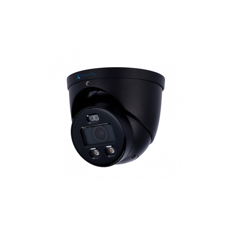 Cámara IP Turret X-Security WizColor. 4 megapíxel, sensor CMOS 1/1,8 pulgadas, resolución 2688x1520, lente de 2,8 mm, microsd hasta 512GB, visión con luz blanca y tecnología IR de hasta 30 metros, funcionalidad WizSense con clasificación de humano y vehículo, WDR 120 dB, resistencia exterior IP67, audio bidireccional mediante micrófono integrado, compatible con ONVIF y PoE IEEE802.3af, cuerpo en color negro.