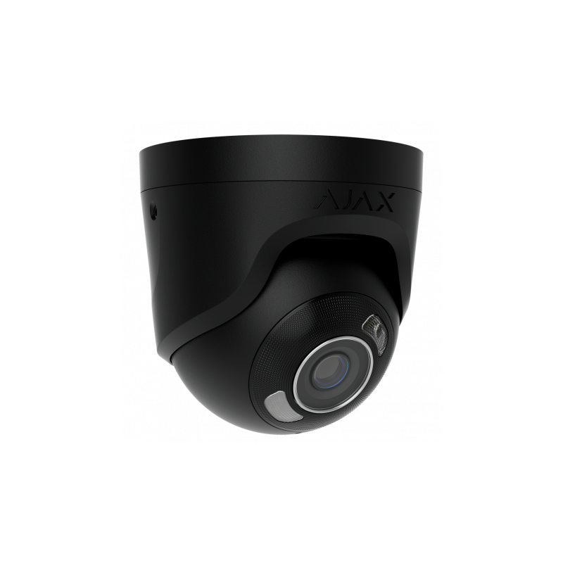 Cámara IP turret de 5 megapíxeles Ajax, equipada con sensor CMOS de 1/2,8 pulgadas, lente de 2,8 mm, visión IR y luz blanca de hasta 50 metros, micrófono integrado, protección IP65, y funciones de inteligencia artificial. Compatible con PoE bajo estándar IEEE802.3at, permite almacenamiento local en ranura MicroSD de hasta 256GB, y cuenta con compresión H.265+, WDR, y tecnología ONVIF para una integración sencilla en sistemas de videovigilancia. Su diseño en color negro proporciona un aspecto discreto y moderno.
