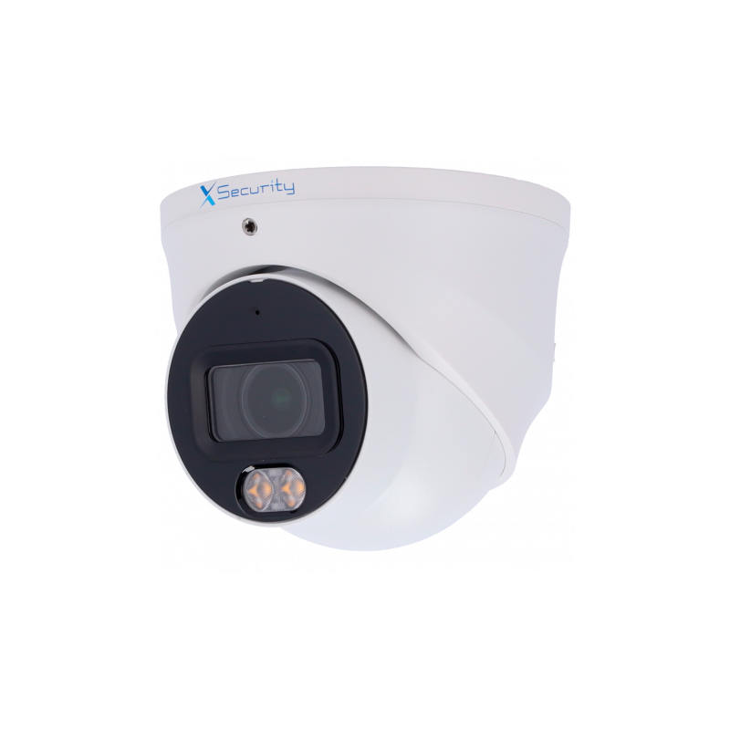 Cámara IP Turret WizColor X-Security. Sensor CMOS 1/1,8 pulgadas de 6 megapíxeles con lente de 2,8 mm, resolución de 3288 x 1850, proporciona imágenes a color real las 24 horas incluso en condiciones de baja iluminación y oscuridad. Incluye luz blanca con alcance de 30 metros y WDR de 120 dB para contraste optimizado. Cuenta con micrófono incorporado, clasificación de humano y vehículo mediante WizSense, almacenamiento en tarjeta MicroSD hasta 256 GB, compresión H.265 y H.264, protección IP67, alimentación PoE y compatibilidad con ONVIF y CGI.