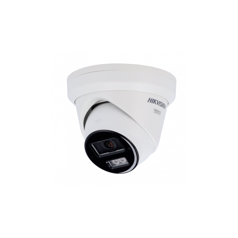 Cámara Turret IP Hikvision, 4 megapíxel, dos lentes en una 2.8 y 4 mm, luz híbrida hasta 30 metros, micrófono dual, PoE, IP67, NEMA 4X.
