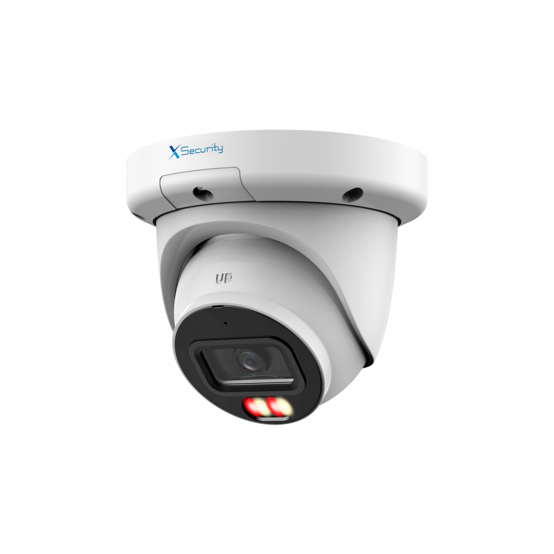 Cámara IP turret X-Security, 4 MP, lente 2.8 mm, WDR 120 dB, IR y luz blanca hasta 50 metros, PoE, IP67, micrófono integrado.