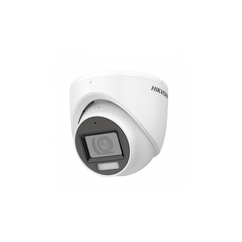 Cámara Turret Hikvision 4en1 de la Gama Value, resolución 2K de 2304x1296, lente de 2,8 mm, audio sobre cable coaxial con micrófono integrado, tecnología hybrid light con IR de 30 metros y luz blanca de 20 metros, impermeable IP67, cuerpo metálico.