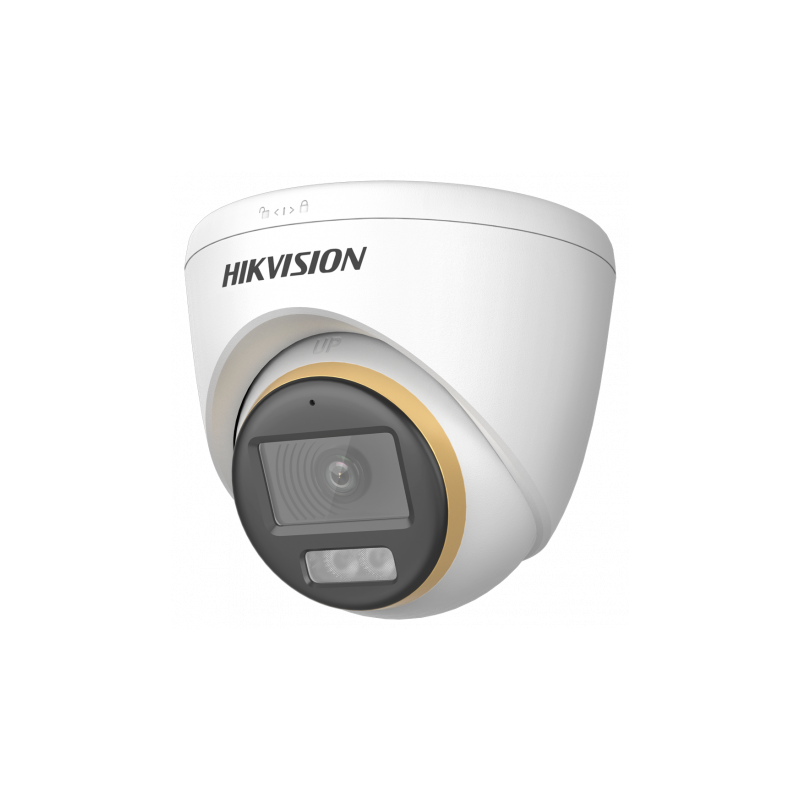 Cámara Turret HDTVI Hikvision de la gama PRO, resolución de 2 megapíxeles (1920x1080), lente de 2.8 mm, tecnología ColorVu para imagen a color durante 24 horas, luz híbrida que combina IR y luz blanca con alcance de 40 metros, alarma luminosa y alimentación PoC sobre cable coaxial, protección impermeable IP67, micrófono integrado y audio sobre coaxial.