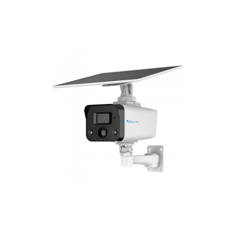 Cámara Bullet IP conectividad 4G, 4 megapíxeles, sensor 1/3 pulgadas Progressive Scan CMOS, lente fija de 3,6 mm, visión 24 horas, compresión H.265 y función P2P. Incorpora panel solar fotovoltaico para operación autónoma y batería de litio recargable, resistente al agua con nivel IP67, micrófono y altavoz integrados, iluminación IR de 30 metros, luz blanca de 20 metros, sensor PIR, detección de anomalías y movimiento, ranura MicroSD hasta 512 GB.