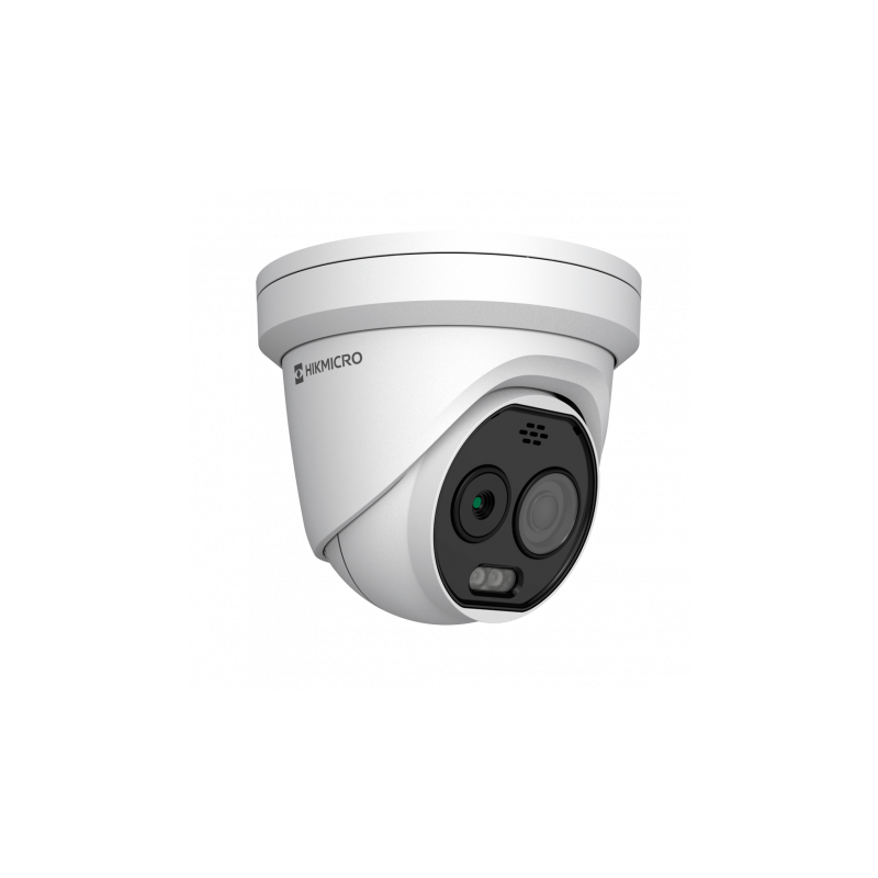 Cámara térmica dual IP Hikmicro, integra sensor térmico de 256 x 192 VOx, lente térmica de 2,1 mm, sensor óptico CMOS de 1/2,7 pulgadas con 5 megapíxeles, lente óptica de 2,2 mm, sensibilidad térmica inferior o igual a 25 mK, proporciona detección preventiva de incendios y alarma, rango para medición de temperatura de menos 20 a 150 °C y precisión de 8 °C. Permite supervisión en tiempo real con baja iluminación de 0,0176 lux, LED infrarrojo con alcance de hasta 30 metros, WDR 120 dB y reducción de ruido 3D. Admite compresión H265 y H264, conexión RJ45, PoE, audio bidireccional, alarmas, ranura MicroSD de hasta 512 GB y grado de protección IP67.