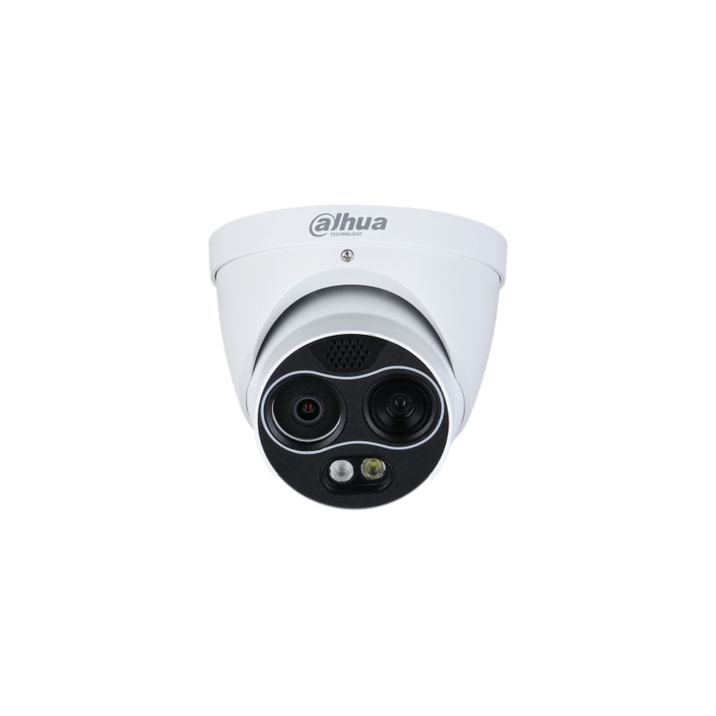 Domo térmico IP híbrido Dahua Eureka Series, imagen térmica de 256 x 192 VOx 12 micrómetros, óptica de 2 mm y sensibilidad inferior a 40 mK, canal visible 4MP con óptica fija de 2 mm e iluminación IR de hasta 30 metros, medición de temperatura de -20 a 550 °C, análisis por inteligencia artificial con detección de calor, intrusión y clasificación de humanos y vehículos, luz blanca y audio de alarma integrados, 2 entradas y 2 salidas de alarma, ranura MicroSD hasta 256 GB, protección IP67, alimentación PoE o de 12 VDC.