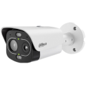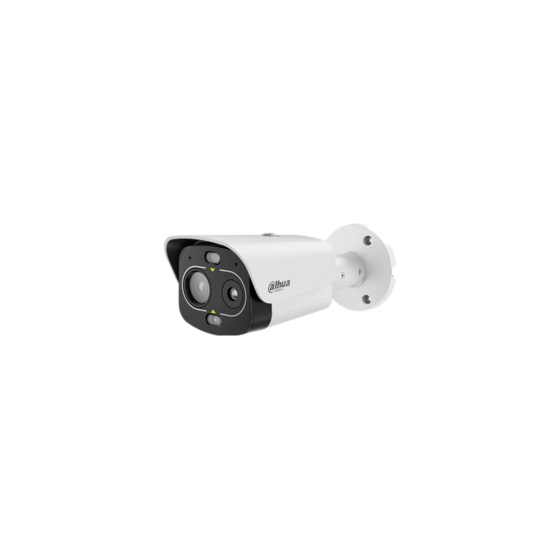 Cámara térmica IP híbrida Dahua Eureka Series, sensor térmico de 256 x 192 tipo VOx de 12 micras, óptica fija de 7 mm, NETD menor o igual a 25 mK, canal visible de 4 megapíxeles, sensor CMOS 1/1.8", óptica fija de 6 mm, infrarrojos hasta 50 metros, luz blanca hasta 30 metros, medición de temperatura de menos 20 grados Celsius a 650 grados Celsius, funciones de inteligencia artificial con protección perimetral, detección de calor, humo y clasificación entre humano y vehículo, doble micrófono, audio y luces rojas y azules para alarma, 2 entradas y 2 salidas de alarma, ranura para tarjeta MicroSD de hasta 256 GB, protección IP67 y antivandálica IK10, alimentación de 12 VCC o PoE.