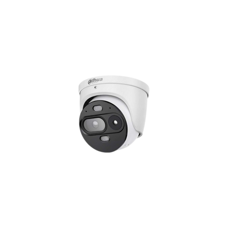 Domo térmico IP híbrido Eureka Series con doble canal térmico de 256 x 192 y visible de 4MP. Lente térmica de 2,6 mm y lente visible de 2,8 mm. Incorpora funciones de detección de calor y fuego, cruce de línea e intrusión, así como clasificación entre humano y vehículo. Ofrece micrófono dual integrado, 1 entrada y 1 salida de audio, 2 entradas y 2 salidas de alarma, ranura MicroSD hasta 256 GB, alimentación por PoE o de 12 a 24 VDC.