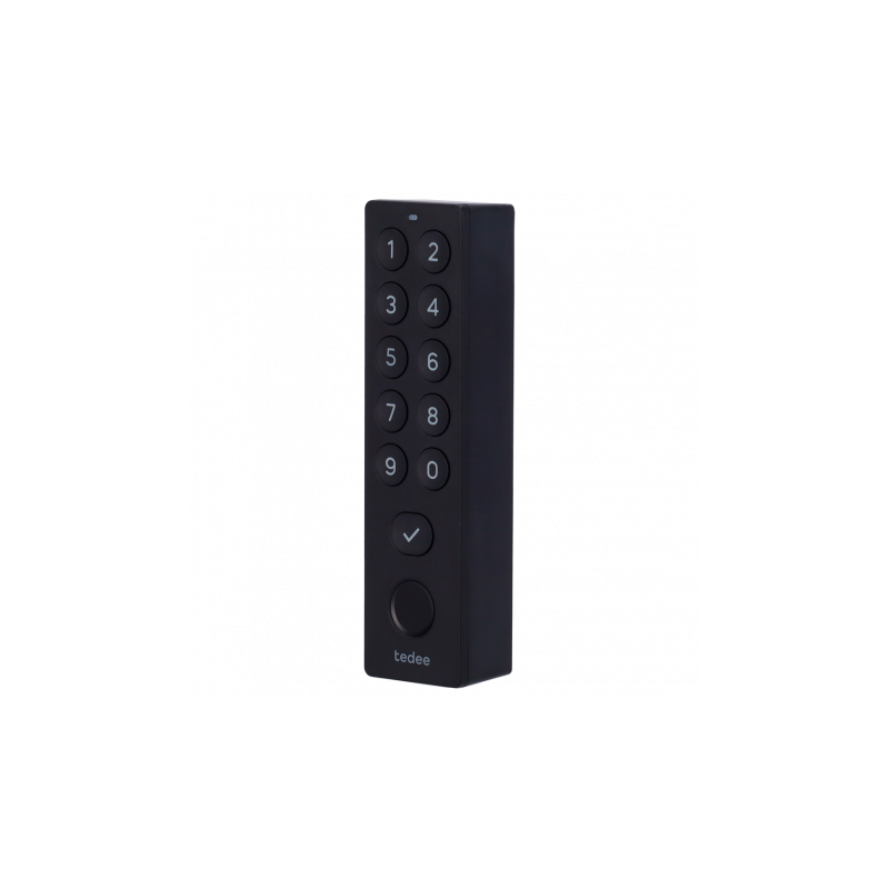 Accesorio teclado Tedee diseñado para cerraduras inteligentes, permite apertura y cierre mediante PIN o huella, configuración de códigos de un solo uso o temporales, funcionamiento con cuatro pilas AAA, comunicación Bluetooth 5.2, diseño estilizado que se adapta a marcos de puertas, compatible con TEDEE-PRO y TEDEE-GO2.