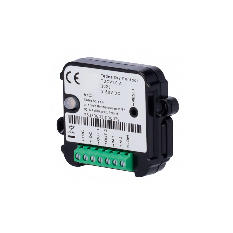 Módulo de entradas y salidas Tedee Dry Contact, diseñado como accesorio para cerradura inteligente, con comunicación Bluetooth, permite accionar la cerradura mediante entradas auxiliares, así como activar salidas auxiliares al operar la cerradura. Alimentación de 6 a 60 VDC, compatible con los modelos TEDEE-PRO y TEDEE-GO2.