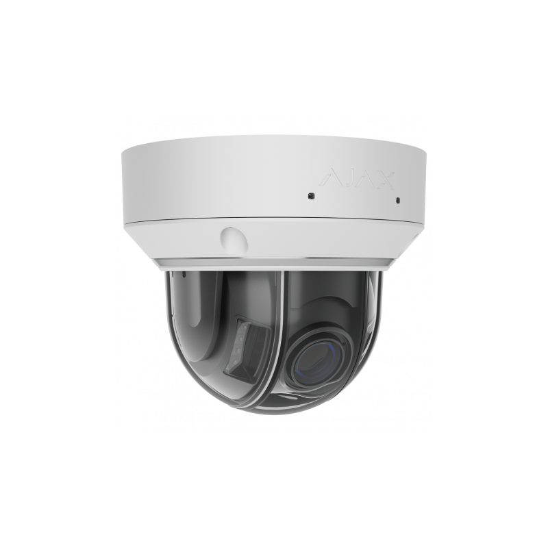 Cámara domo IP de 5 megapíxeles, lente motorizada de 2.8 a 12 mm, IR hasta 40 metros, luz blanca hasta 25 metros, PoE, protección IP67, IK10.