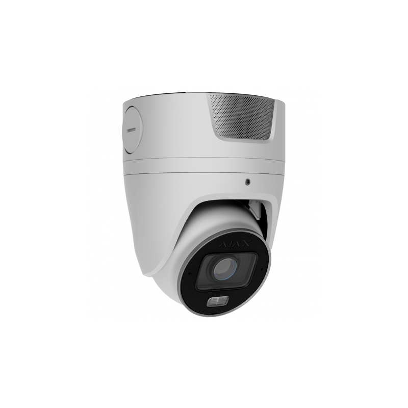 Cámara IP tipo turret AJAX con resolución de 8 megapíxeles, incorpora sensor 1/1,8" progressive scan CMOS, lente varifocal motorizada de 2,8 a 12 mm, visión nocturna mejorada con luz blanca hasta 40 metros y alcance IR de 60 metros, micrófonos integrados, compresión H.265, protección IP67 e IK10. Cuenta con tecnología TrueWDR de 120 dB, ranura para tarjeta MicroSD de hasta 256 GB, alimentación PoE, funciones avanzadas de detección de movimiento e inteligencia artificial. Compatible con ONVIF y P2P para una integración y acceso sencillo.