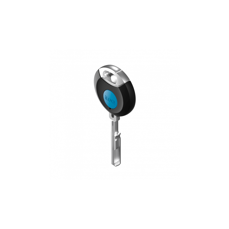 Llave inteligente para sistemas iLOQ, diseñada para cilindros S5, incorpora chip RFID y NFC, operativa sin baterías ni cableado al estar alimentada mediante inducción NFC para programación, cifrado de información AES-256, gestión avanzada de grupos, horarios y registros de acceso, apta para uso exterior con certificación IP68, cuerpo de acero inoxidable y mango de polímero reforzado con fibra de vidrio.
