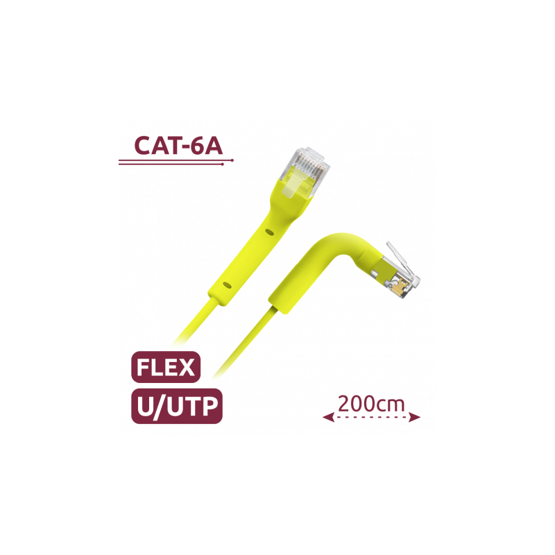 Cable UTP flexible de 2 metros, categoría 6A, conectores RJ45, cubierta TPE, color amarillo, optimizado para redes de alta densidad.
