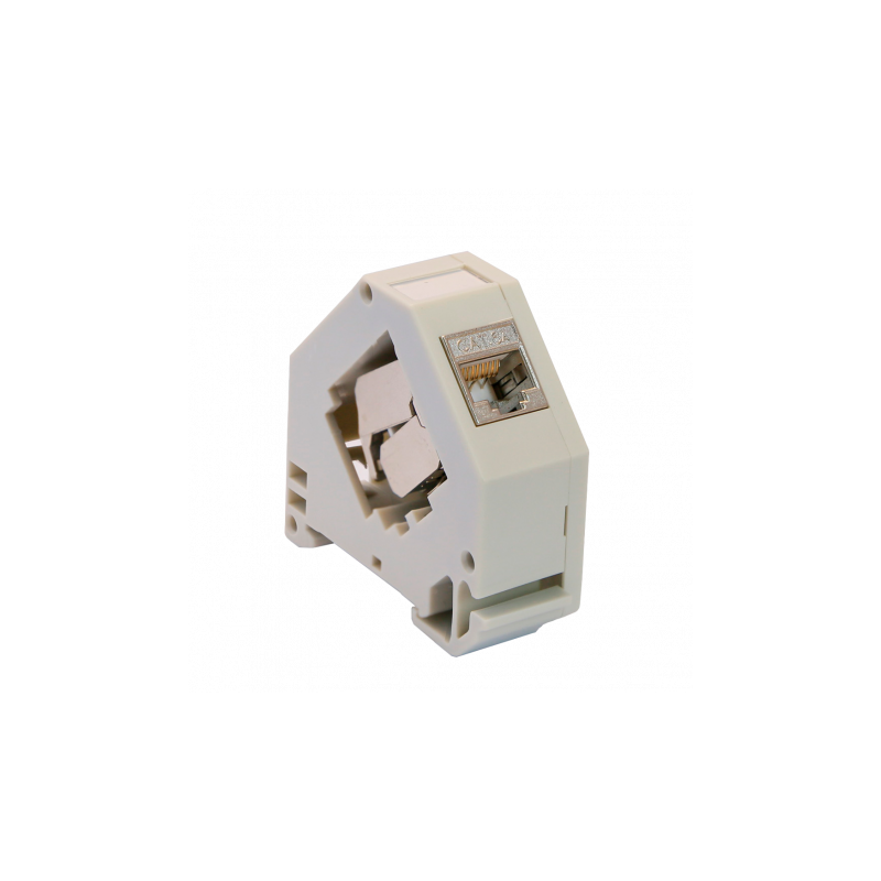 Conector RJ45 diseñado para cables FTP, compatible con categoría 6A, instalación sencilla sin necesidad de herramientas, apto para montaje en carril DIN, color gris, estructura apantallada y compatible con carriles DIN estándar.