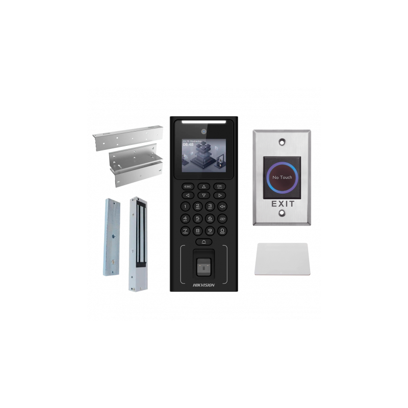 Kit de control de acceso facial, huella, tarjeta MF y PIN, solución autónoma, incluye ventosa magnética de 272 kg con soporte en L y Z, pulsador de salida sin contacto y tarjeta MF, pantalla a color de 2,4 pulgadas, controladora integrada, montaje en superficie, gestión mediante iVMS-4200 y aplicación Hik-Connect.