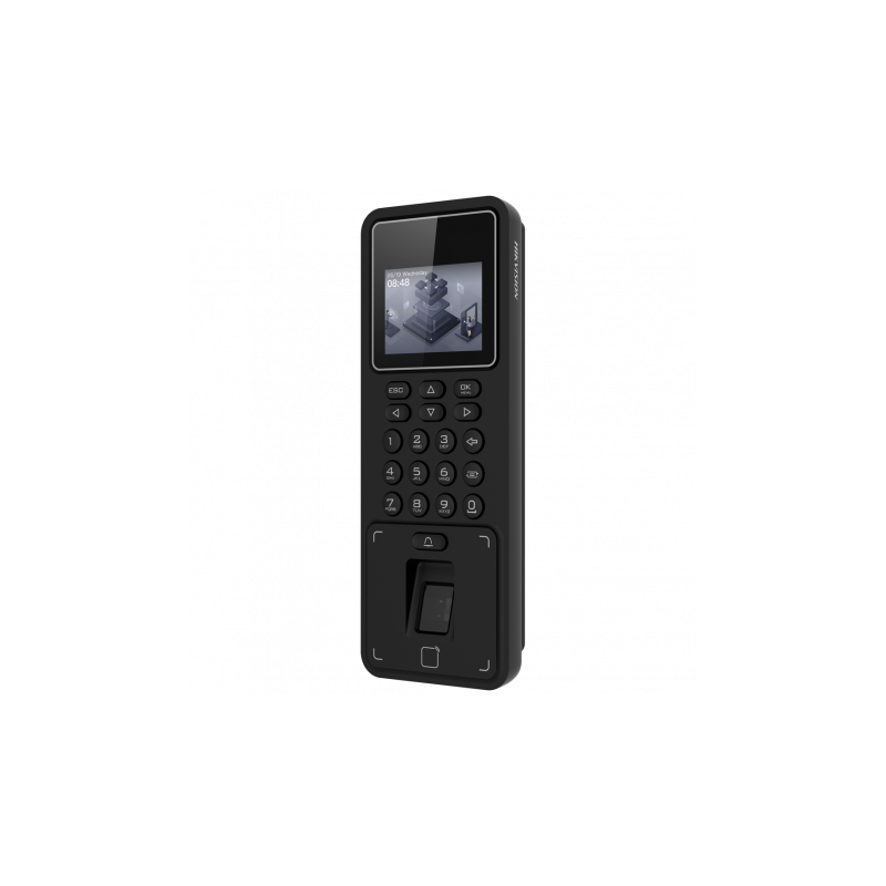 Control de acceso y presencia Hikvision. Identificación por huella, tarjeta MF y PIN, capacidad para 3.000 usuarios, hasta 100.000 registros. Interfaz de red por TCP/IP, WiFi, USB y RS485. Pantalla TFT a color de 2.4 pulgadas, sistema autónomo con controladora integrada, compatible con software iVMS-4200 y la aplicación móvil Hik-Connect.