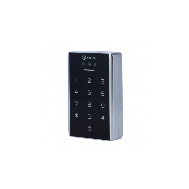 Control de acceso Safire, reconocimiento facial, tarjeta EM, PIN y APP, WiFi, Wiegand 26, para exterior IP68, alimentación DC 12 V.