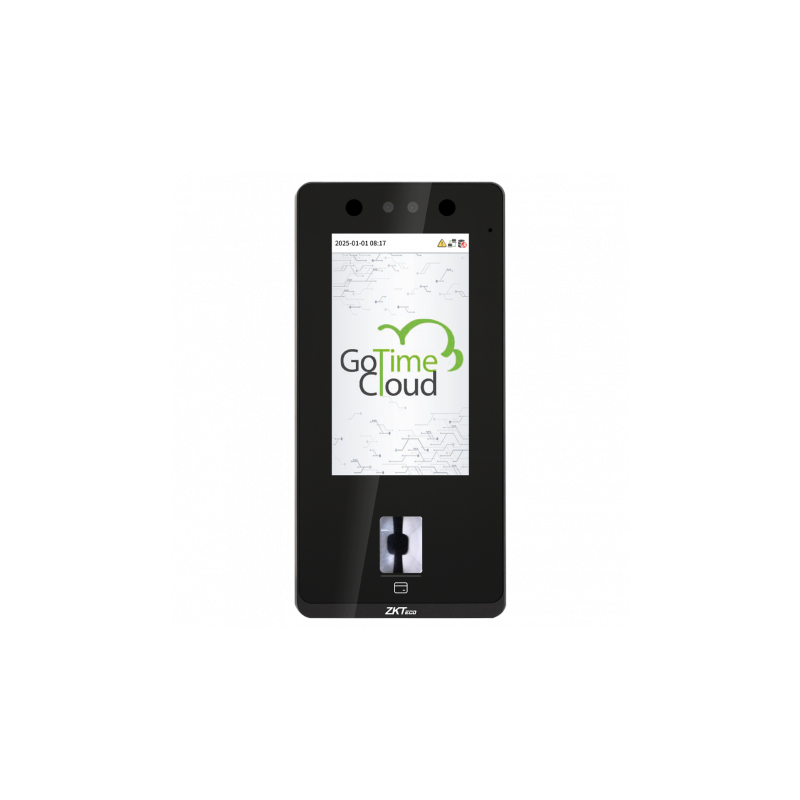 Terminal de control de presencia y acceso biométrico con diseño autónomo, protección exterior IP65, identificación por reconocimiento facial, huella dactilar, tarjeta de proximidad MF y PIN, capacidad para 8.000 huellas, 6.000 rostros, 8.000 tarjetas y 300.000 registros. Equipada con pantalla táctil TFT de 4.3 pulgadas para una gestión sencilla y configuración directa, admite comunicación TCP/IP y USB, incluye relé integrado. Compatible con GoTime Cloud para control de horarios y gestión de presencia en la nube.