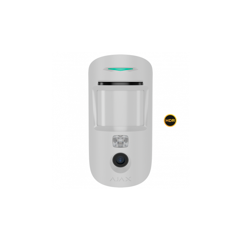 Fotodetector de movimiento PhOD Ajax MotionCam HDR PhOD Jeweller, diseñado para uso interior, combina detección precisa con verificación visual mediante imágenes hasta resolución VGA de 640 x 480, tecnología HDR para fotos nítidas incluso en condiciones de poca luz o alto contraste, envío de hasta 5 imágenes por cada detección, certificado grado 2, inalámbrico en la frecuencia 868 MHz Jeweller con alcance de hasta 1700 metros en espacio abierto, inmunidad a mascotas de hasta 20 kg, gestión de privacidad avanzada, alimentación por 2 pilas CR123A de 3.0 V con duración estimada de 4 años, rango de detección de 12 metros, compatible con Ajax Hub 2 y Hub 2 Plus, color blanco. Permite foto bajo demanda, foto por alarma, por escenario y por programación. El gestor de privacidad otorga control total al usuario sobre los permisos de solicitud de imágenes en todo momento.