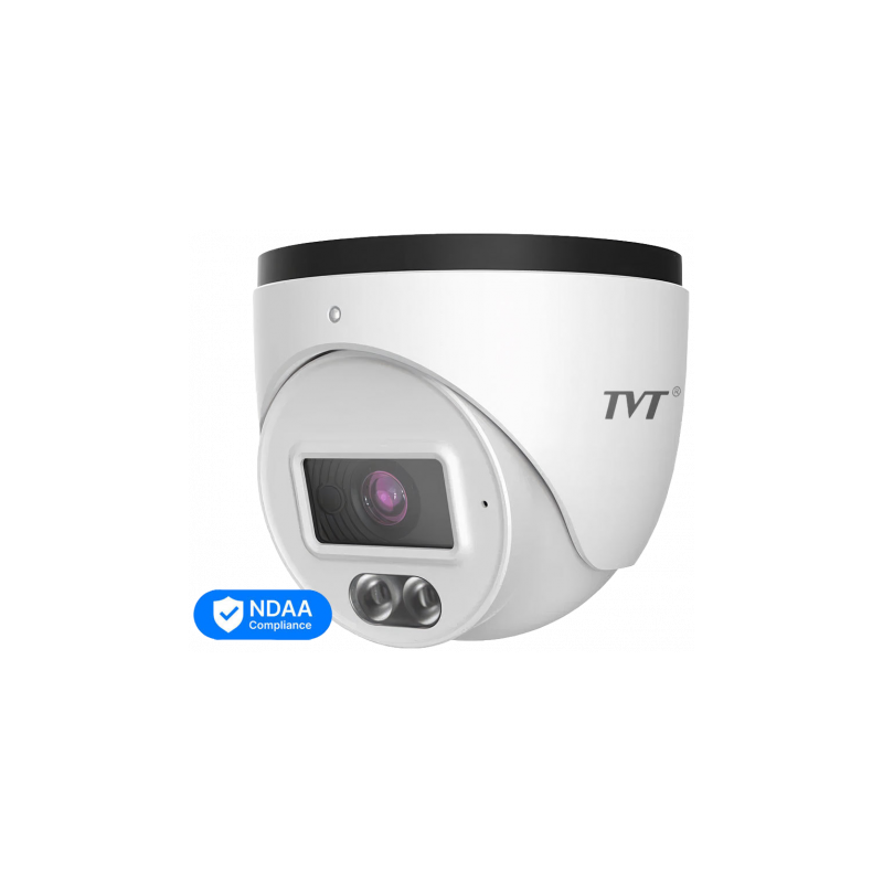Cámara IP turret TVT 4MP, lente fija 2,8 mm, micrófono integrado, compresión H.265+, IR 30 m + luz blanca 20 m, funciones inteligentes (detección de humanos, cruce de línea, intrusión), PoE, IP67