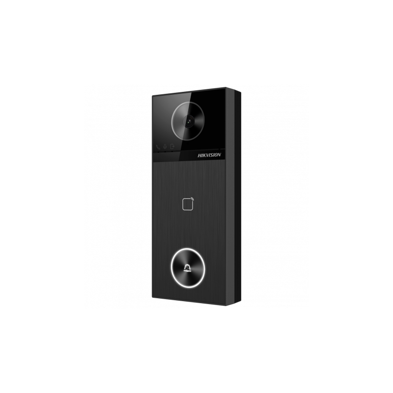 Videoportero IP WiFi con cámara de 4 megapíxeles, audio bidireccional, apertura por tarjeta MF y Bluetooth, 2 salidas de relé, funciona con app móvil con o sin monitor, apto para exterior gracias a su protección IP65, montaje en superficie. Alimentación por PoE estándar o DC de 12 V, incorpora control de acceso, permite identificación mediante tarjetas MF de 13.56 MHz y Bluetooth. Incorpora botonera física, visión nocturna, lente gran angular, y admite comunicación remota desde app o monitor interior. Dispone de ranura microSD para almacenamiento y es compatible con los softwares iVMS-4200 y app Hik-Connect.