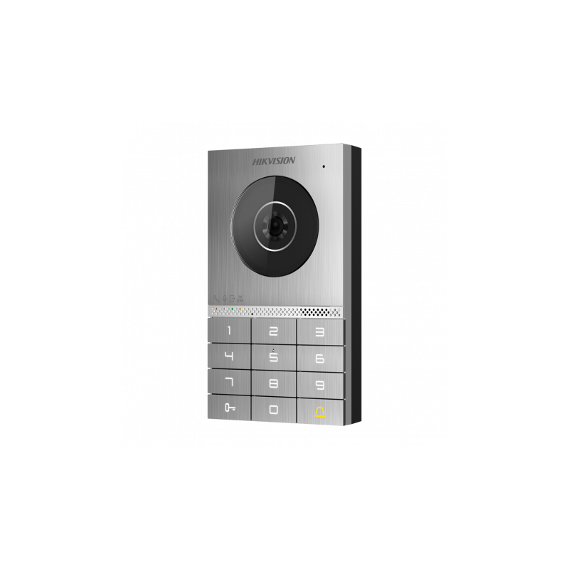 Videoportero de 2 hilos HD con cámara de 2 megapíxeles, audio bidireccional, lector de tarjetas MF de 13,56 MHz y teclado para PIN, dos relés para apertura de puertas, monitoreo remoto con aplicación móvil a través de monitor interior, apto para exterior IP65, resistente a impactos antivandálicos IK08, instalación en superficie y comunicación sobre cableado convencional. El panel exterior permite la llamada y control de acceso, soporta apertura mediante tarjetas, llaveros o código numérico, y es compatible con la app Hik-Connect para recibir llamadas, visualizar la cámara y realizar aperturas remotas desde cualquier ubicación.