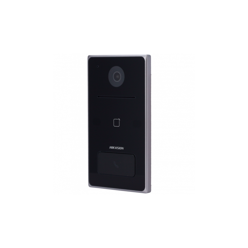 Videoportero IP WiFi para un apartamento, cámara de 2 megapíxeles con lente gran angular, visión nocturna, audio bidireccional, apertura de puerta mediante tarjeta MF de 13,56 MHz, 1 relé, botón mecánico de llamada, permite conexión por PoE o DC 12 V, admite monitorización remota desde software iVMS-4200, app móvil Hik-Connect o monitor interior, soporte para llamada desde app con o sin monitor o P2P, estructura diseñada para exterior con protección IP65, montaje en superficie.