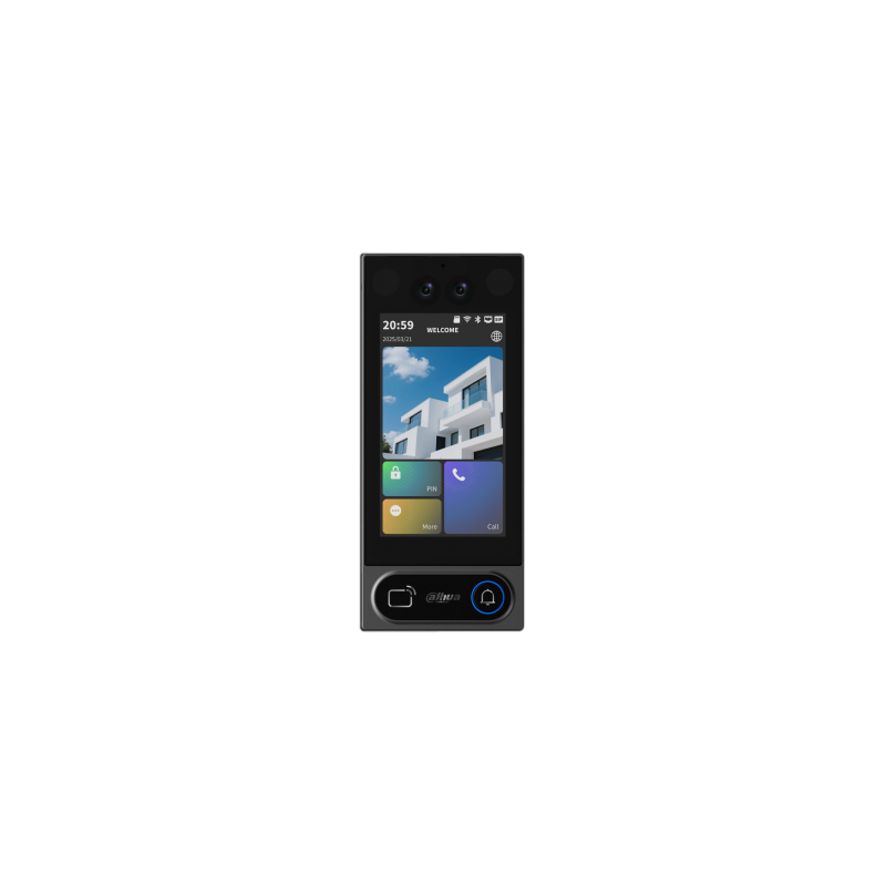 Unidad exterior IP con doble cámara 2MP, pantalla táctil 5", verificación facial, tarjeta, Bluetooth y PIN. Audio bidireccional. PoE, Wi-Fi e IP65.