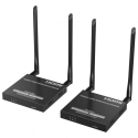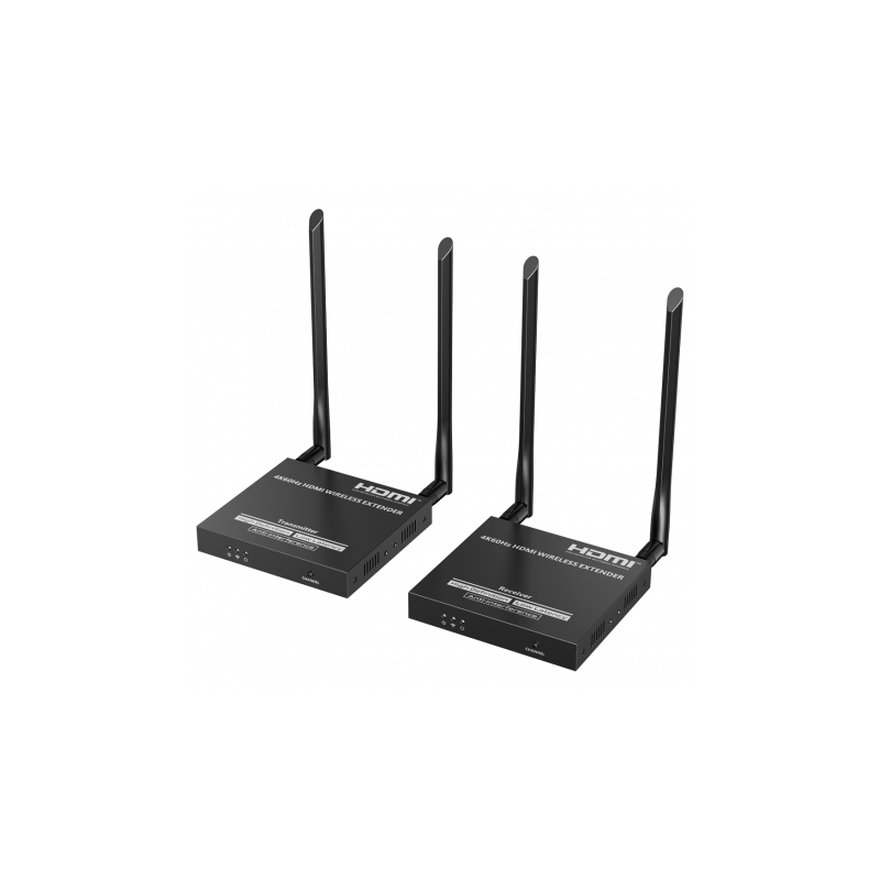 Extensor inalámbrico de señal HDMI, alcance 50 metros, resolución 4K, conexiones de uno a cuatro, frecuencia 5,18 a 5,24 GHz.