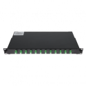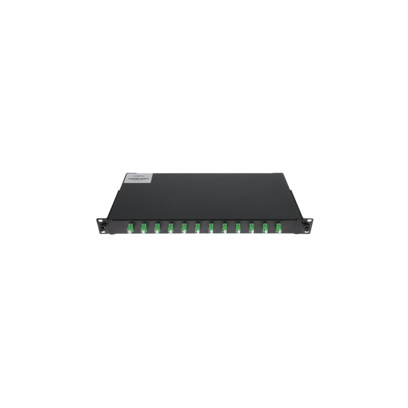 Patch panel de fibra, 12 puertos LC/APC Duplex, bandeja de empalme, formato enrackable, tamaño 1U, color verde.