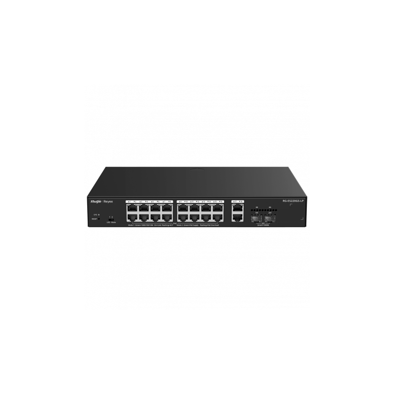 Switch PoE gestionable en la nube Reyee. 16 puertos PoE 802.3af/at, 2 puertos SFP, 2 uplink RJ45, un total de 26 puertos RJ45 de 10/100/1000 Mbps y 2 SFP gigabit, hasta 30W por puerto PoE y máximo 130W de potencia total, incluye funciones VLAN, aislamiento de puertos, detección de loops, limitación de velocidad por puerto y gestión a través de plataforma web, en la nube o por aplicación.