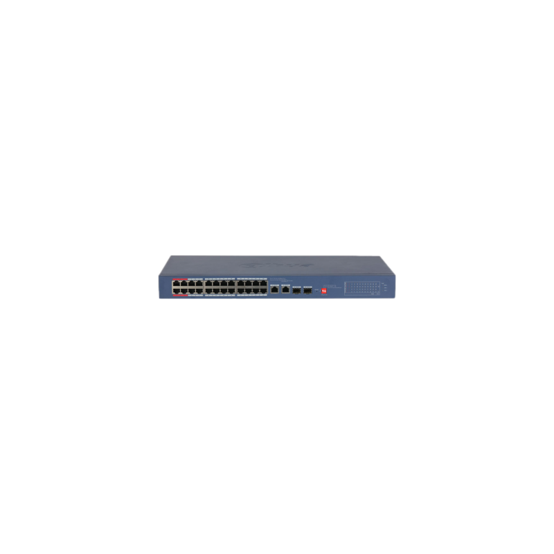 Switch gestionable Smart Dahua Serie CS4226, 24 puertos PoE Fast Ethernet y 2 puertos combo RJ45/SFP, permite administración local o remota a través de la nube con DoLynk Care, hasta 90 W por puerto y 240 W totales, PoE Watchdog, topología visual, protección contra sobretensión, descargas y rayos, montaje en escritorio o rack, diseñado para redes CCTV y entornos SMB.