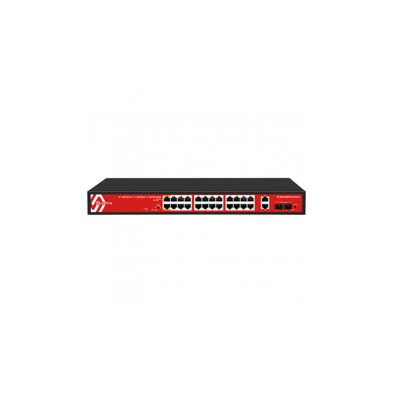 Switch de sobremesa Safire, diseñado para entornos que requieren alta capacidad de alimentación PoE, con 24 puertos PoE+ de hasta 30 W, un puerto Hi-PoE de 60 W, dos puertos uplink SFP y dos RJ45 adicionales, velocidad de transmisión gigabit, gestión PoE mediante Watchdog, permite un total máximo de 285 W en todos los puertos, incluye funciones AI Watchdog para supervisión continua, interfaz accesible y modos configurables mediante dip switch para aislamiento, extensión de alcance y operación predeterminada.