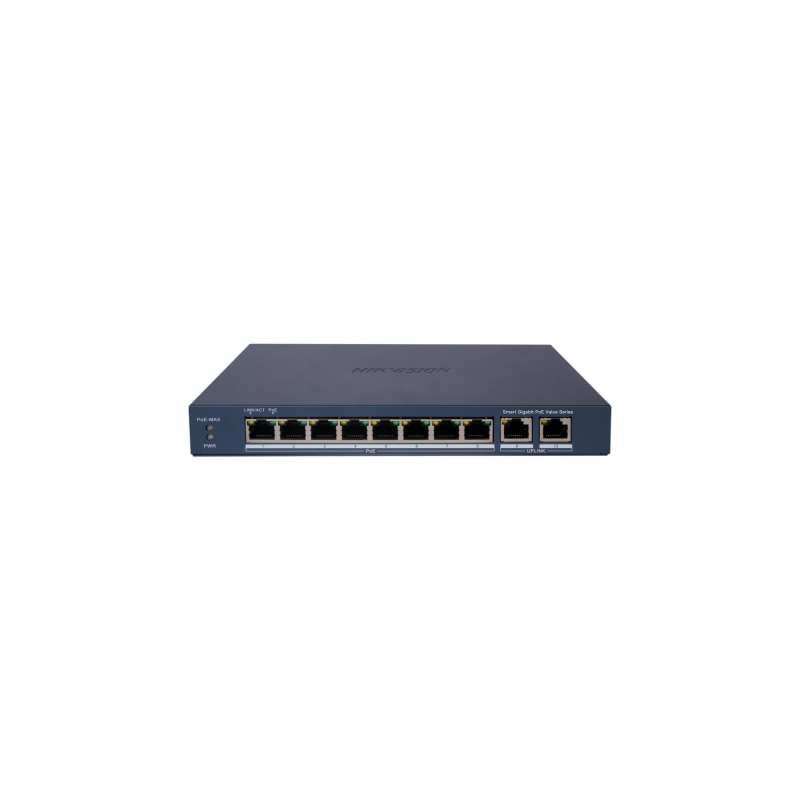 Switch PoE gestionable, 8 puertos RJ45 de 10/100/1000 Mbps, 2 uplink, PoE total 60W, alcance hasta 300 metros, Hikvision.
