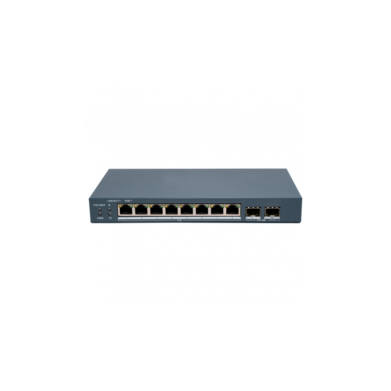 Switch gestionable Hikvision con 8 puertos PoE y 2 puertos SFP, capacidad total de alimentación PoE de hasta 80W, compatible con los estándares IEEE 802.3af y 802.3at, soporta VLAN, aislamiento de puertos, detección de bucle, agregación de enlaces, PoE Watchdog, y funciones SNMP, administración sencilla mediante Web, Hik-Partner Pro y Hik-Central Pro, diseño compacto de sobremesa y funcionamiento estable.