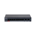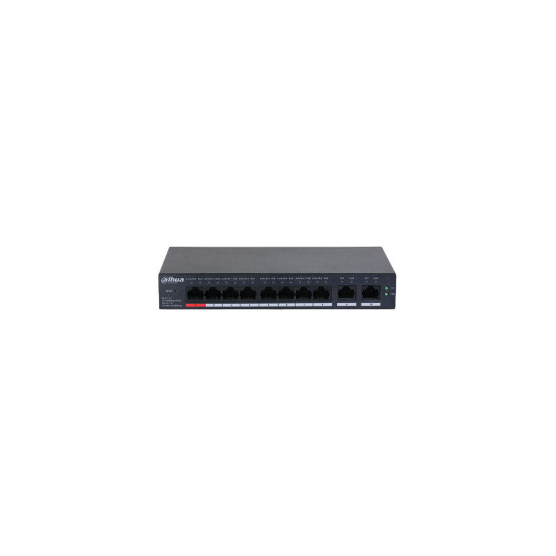 Switch cloud gestionado Dahua con 8 puertos PoE Fast Ethernet y 2 puertos uplink Gigabit, permite entrega PoE total de 110 W con un puerto BT de hasta 90 W, incorpora gestión cloud DoLynk Care, función PoE inteligente, modo PoE larga distancia hasta 250 metros y PoE Watchdog, soporta STP y protección de bucle, dispone de carcasa metálica apta para instalación en sobremesa o pared.