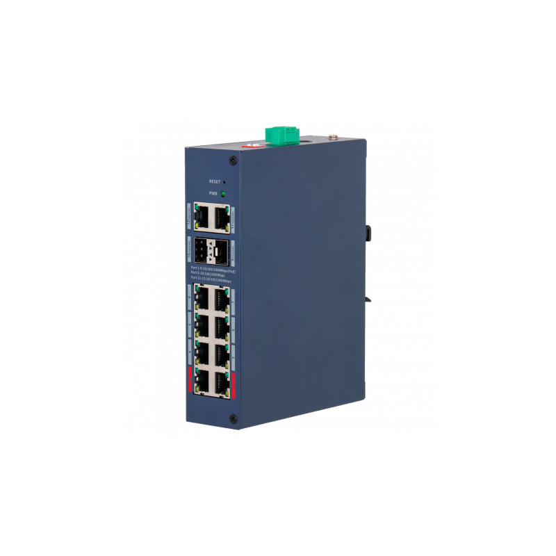 Switch PoE industrial X-Security gestionable para carril DIN, equipado con 8 puertos PoE RJ45 Gigabit, 2 puertos RJ45 Uplink Gigabit y 2 puertos SFP Gigabit, compatible con velocidades de 10, 100 y 1000 Mbps, ofrece hasta 90W en los puertos 1 y 2 y hasta 30W en los puertos 3 a 8, máximo 110W, admite PoE estándar, PoE+, Hi-PoE e IEEE 802.3bt, extiende señal PoE hasta 250 metros, dispone de función PoE Watchdog, soporta VLAN, STP, RSTP y StaticLAG, incluye montaje en carril DIN.