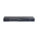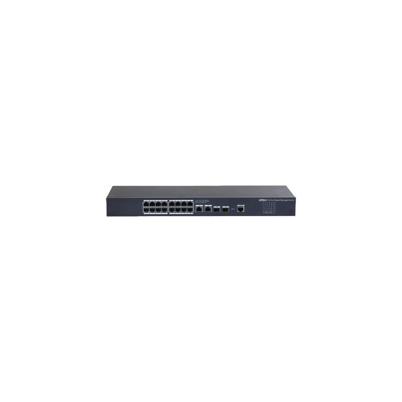 Switch gestionable Gigabit Dahua con 18 puertos RJ45 compatibles con velocidades de 10, 100 y 1000 Mbps, 2 puertos SFP Gigabit para conexiones ópticas avanzadas, capacidad de conmutación de 56 Gbps, interfaz de gestión web segura por HTTP y HTTPS, soporta protocolos STP, RSTP, LACP, IGMP Snooping, QoS, LLDP, tabla MAC de 8K, y hasta 4K VLAN. Equipado con funciones de seguridad y administración avanzadas, diseño sin ventilador, alimentación a de 12 VDC, incluye adaptador de corriente.