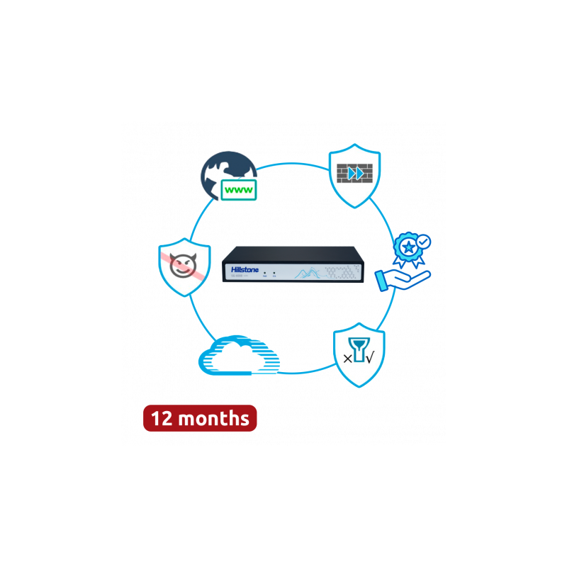 Firewall de nueva generación Hillstone Networks para redes empresariales pequeñas y medianas, protección avanzada con detección proactiva de amenazas, control granular de aplicaciones y operaciones de seguridad automatizadas. Rendimiento de firewall de 1 Gbps, throughput NGFW de 400 Mbps, admite 450000 sesiones concurrentes, 5 puertos 10/100/1000BASE-T y 1 puerto 1GE SFP. Incluye funcionalidades como IPS, antivirus, filtrado de URL, control de aplicaciones, reputación de IPs, protección C2, calidad de servicio QoS y sandbox. Gestión centralizada y automatizada, visibilidad total del tráfico, soporte para VPN IPsec y Zero Trust Network Access.