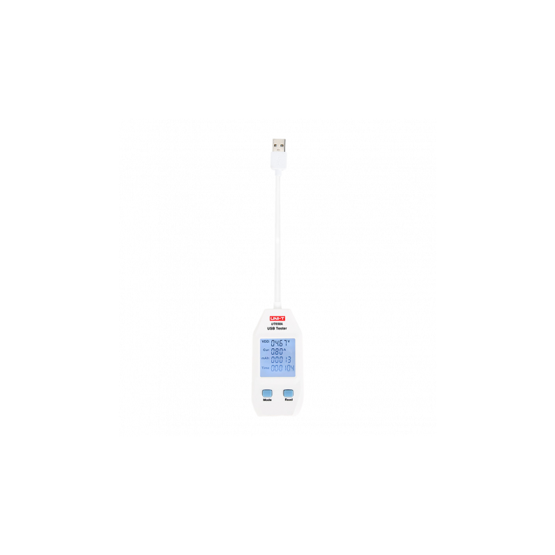 Medidor de corriente y tensión UNI-T, conexión USB tipo A, mide de 4 a 24 VDC y hasta 3A, pantalla LCD, compatible con carga rápida QC 3.0.