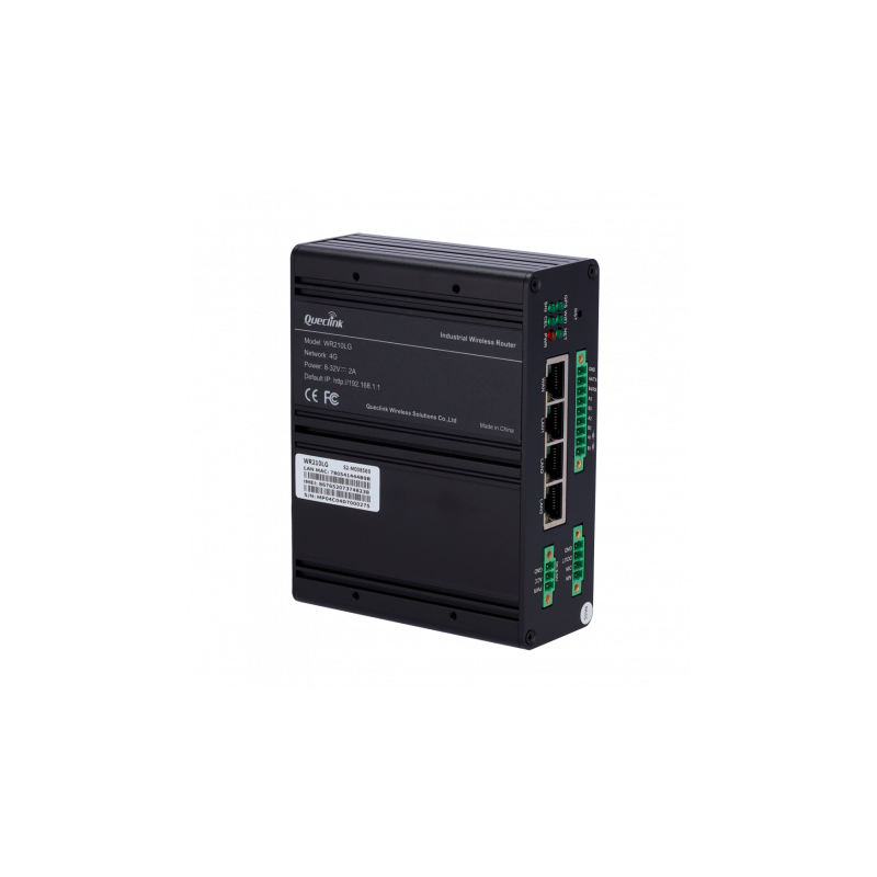 CPE celular industrial Queclink WR210LG, conectividad 4G LTE de alta velocidad, descarga máxima de 150 Mbps, carga máxima de 50 Mbps, módem global, soporta múltiples interfaces físicas incluyendo 4 puertos ethernet con una entrada WAN y tres LAN, una entrada RS232, tres entradas RS485 y diez GPIO, montaje en carril DIN, compatible con WiFi 802.11b/g/n/ac, gestión avanzada de red mediante protocolos OpenVPN, Ipsec, GRE, PPTP, L2TP y Stunnel, administración segura con APN/VPDN para redes privadas y respaldo de SIM dual, posicionamiento GNSS integrado, adecuado para aplicaciones M2M, preparado para aplicaciones en telecomunicaciones, transporte, energía, automoción y entornos industriales.