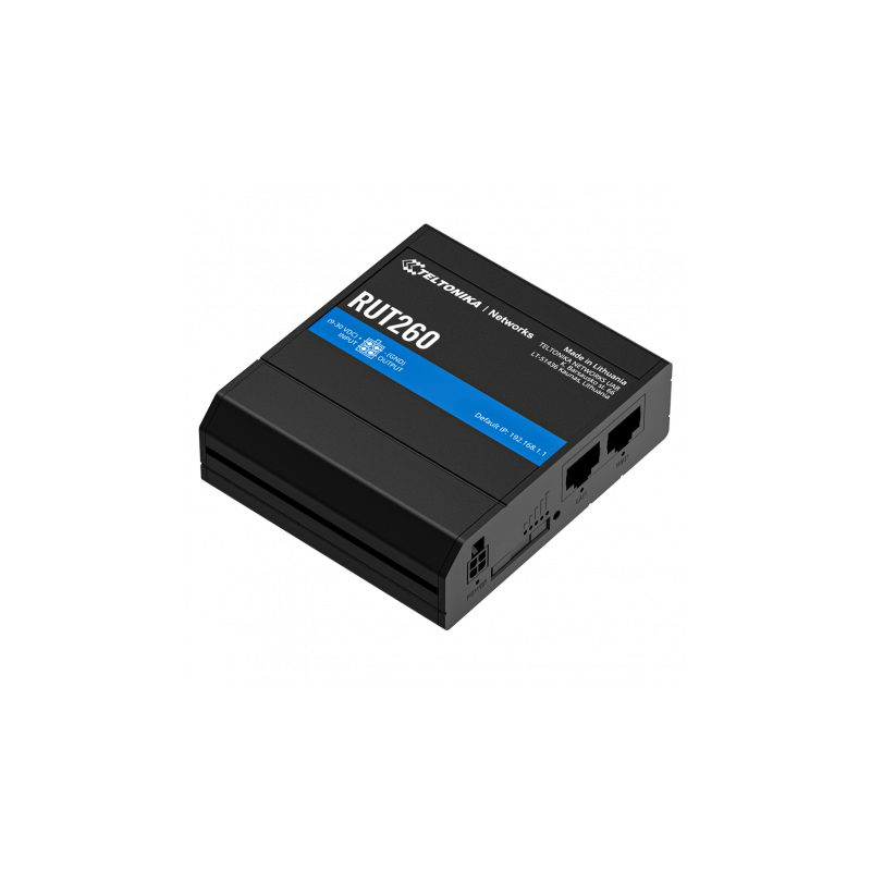 Router 4G industrial Teltonika, con dos puertos Ethernet RJ45 Fast Ethernet, conectividad 4G LTE Cat 6 de hasta 300 Mbps, entrada y salida digital, Wi-Fi 802.11b/g/n a 2,4 GHz y carcasa de aluminio. Diseñado para aplicaciones de red móvil críticas, este modelo compacto es adecuado para IoT, automatización industrial, sistemas de monitoreo remoto y vehículos. Incorpora gestión remota avanzada mediante RMS y funcionalidades VPN, permitiendo configuraciones y monitoreo de manera centralizada y conexiones protegidas a través de protocolos VPN. Su estructura robusta y amplias opciones de conectividad aseguran rendimiento estable en entornos industriales exigentes.