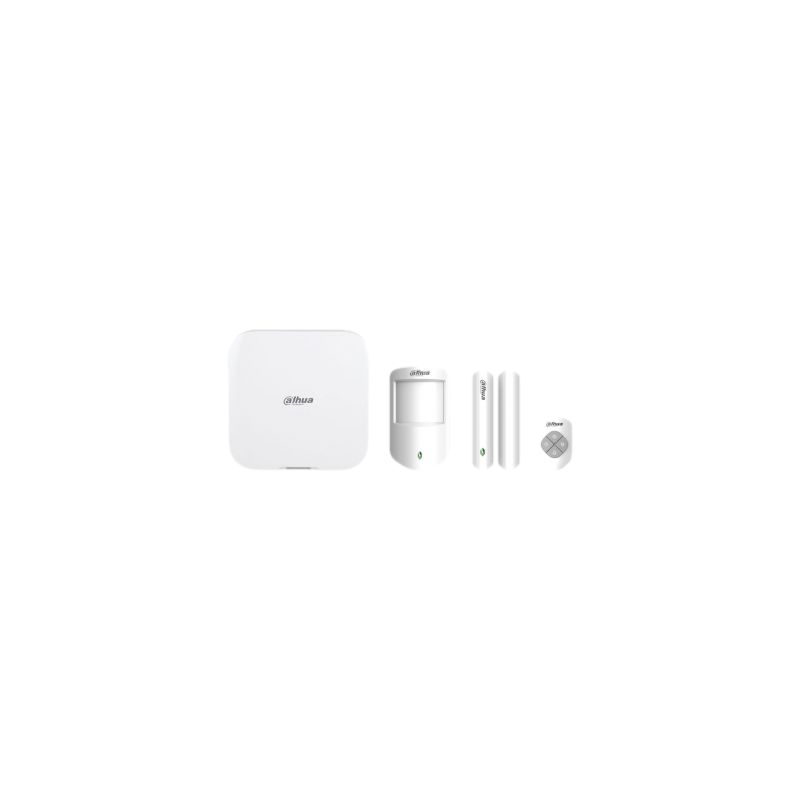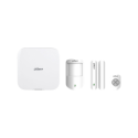 Kit de alarma vía radio Dahua con hub equipado con conectividad Ethernet y WiFi, soporta hasta 150 periféricos inalámbricos y 8 cámaras IP para verificación de alarmas, comunicación bidireccional con salto de frecuencia y cifrado AES128, incluye detector PIR, contacto magnético y mando inalámbrico.