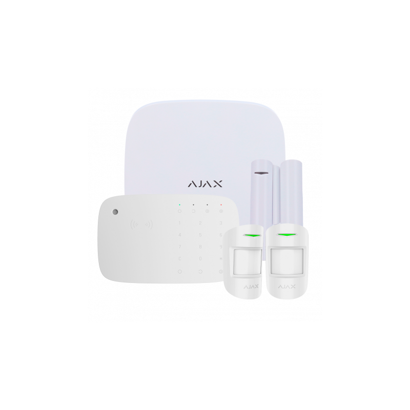 Kit de alarma profesional certificado Grado 2, comunicación Ethernet y dual SIM 4G, integra protocolos Jeweller, Wings y Fibra, incluye panel de control, teclado, dos detectores PIR y un contacto magnético, admite hasta 100 dispositivos compatibles, acceso remoto mediante software de PC y aplicación móvil.