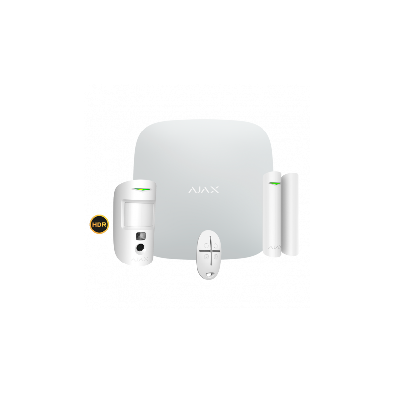 Kit de alarma profesional certificado Grado 2, compatible con comunicación Ethernet, Wi-Fi, dual SIM 4G, sistema inalámbrico de 868 MHz Jeweller y Wings, compuesto por Ajax HUB 2 Plus, un detector de movimiento con cámara PIRCAM HDR, un contacto magnético y un mando. El sistema de alarma anti-intrusión Ajax integra comunicación inalámbrica bidireccional. La conexión inalámbrica asegura alta fiabilidad mediante el protocolo avanzado Jeweller con cifrado AES de alta seguridad. La supervisión inteligente detecta inhibición y reduce los costes al optimizar la duración de las baterías, manteniendo la protección. El alcance inalámbrico cubre hasta 2 mil metros en espacio abierto. El sistema incluye funciones para instalación sencilla, como soporte inteligente Smart-Bracket y vinculación ágil de dispositivos. Permite hasta 200 zonas inalámbricas, posibilidad de agrupación en 25 grupos, configuración flexible con modos de armado, armado parcial, desarmado, zona de 24 horas o zonas con retardo de entrada y salida. El panel AJ-HUB2PLUS-W admite alimentación AC de 110 a 250 V y batería de respaldo recargable con autonomía de hasta 15 horas. Incluye el protocolo Wings para recepción de imágenes del fotodetector AJ-MOTIONCAM-HDR-W. La conectividad Ethernet facilita acceso remoto para usuarios e instaladores, compatible con aplicaciones móviles para iOS, Android y software de escritorio AJAX PRO Desktop. Permite gestionar el sistema, usuarios, permisos, dispositivos y configuraciones desde la nube sin abrir puertos ni requerir IP fija. El usuario recibe notificaciones al instante en aplicaciones móviles y escritorio. El sistema permite agregar hasta 100 cámaras IP o canales de videograbador para ver imágenes en directo. El kit incluye el panel de control AJ-HUB2PLUS-W, un fotodetector AJ-MOTIONCAM-HDR-W, un contacto magnético AJ-DOORPROTECT-W y un control remoto AJ-SPACECONTROL-W.