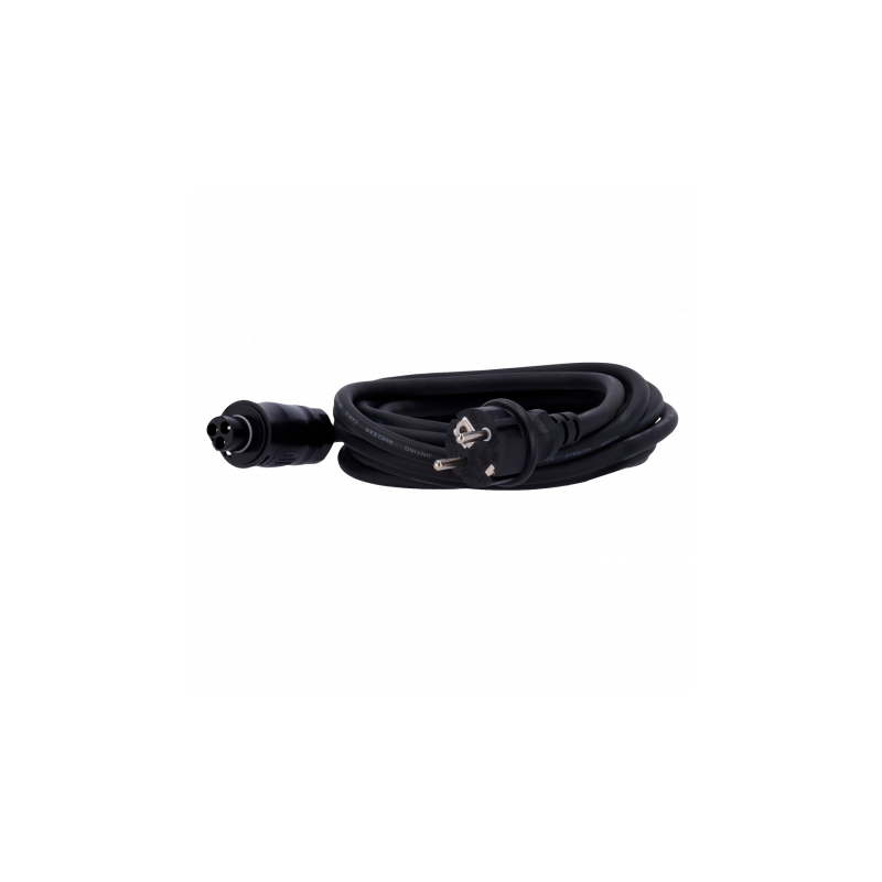 Conector solar AC 3 pines, macho a Schuko, longitud 5 metros, IP68, tensión máxima 1500 V, sección 3x 1.5 mm2, vida útil 10 años.