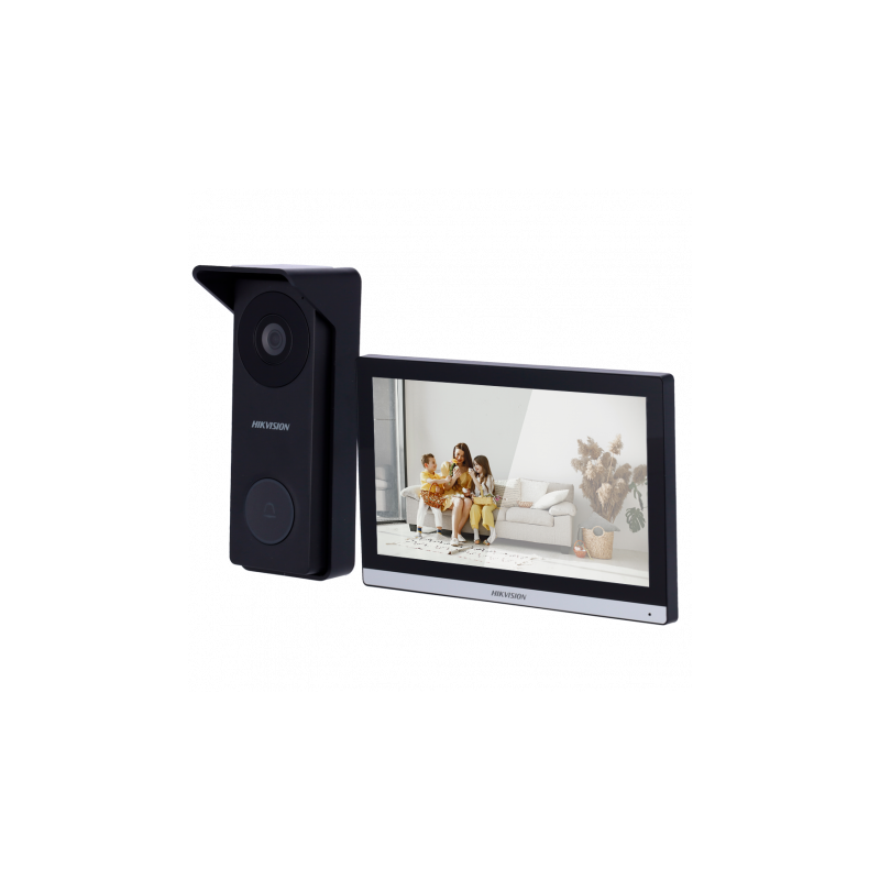 Kit de videoportero Hikvision, cámara 2 Mpx, monitor TFT 7 pulgadas, conexión de 4 hilos y WiFi, exterior IP65, antivandálico IK08.