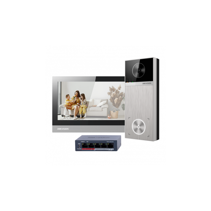 Kit de videoportero IP y WiFi Hikvision formado por una placa externa DS-KV6114-MWBE1 con cámara HD de 4 megapíxeles para montaje en superficie, monitor interior DS-KH8380-WTE1 de 7 pulgadas con pantalla táctil TFT LCD, switch PoE estándar, tecnología Bluetooth compatible con HikCentral y HikConnect Teams, control y monitorización desde software iVMS-4200 o la app móvil Hik-Connect, admite la incorporación de hasta 16 monitores adicionales como extensiones, relés internos en el monitor, instalación sobre superficie, protección IP65.
