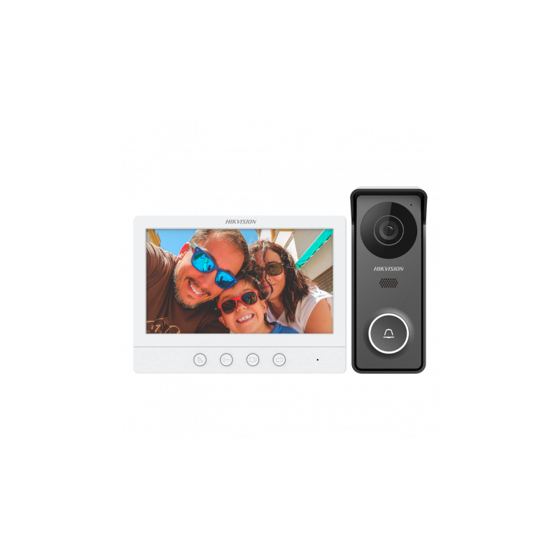Kit de videoportero Hikvision, tecnología analógica de 4 hilos, monitor de 7 pulgadas, cámara HD, instalación en superficie.